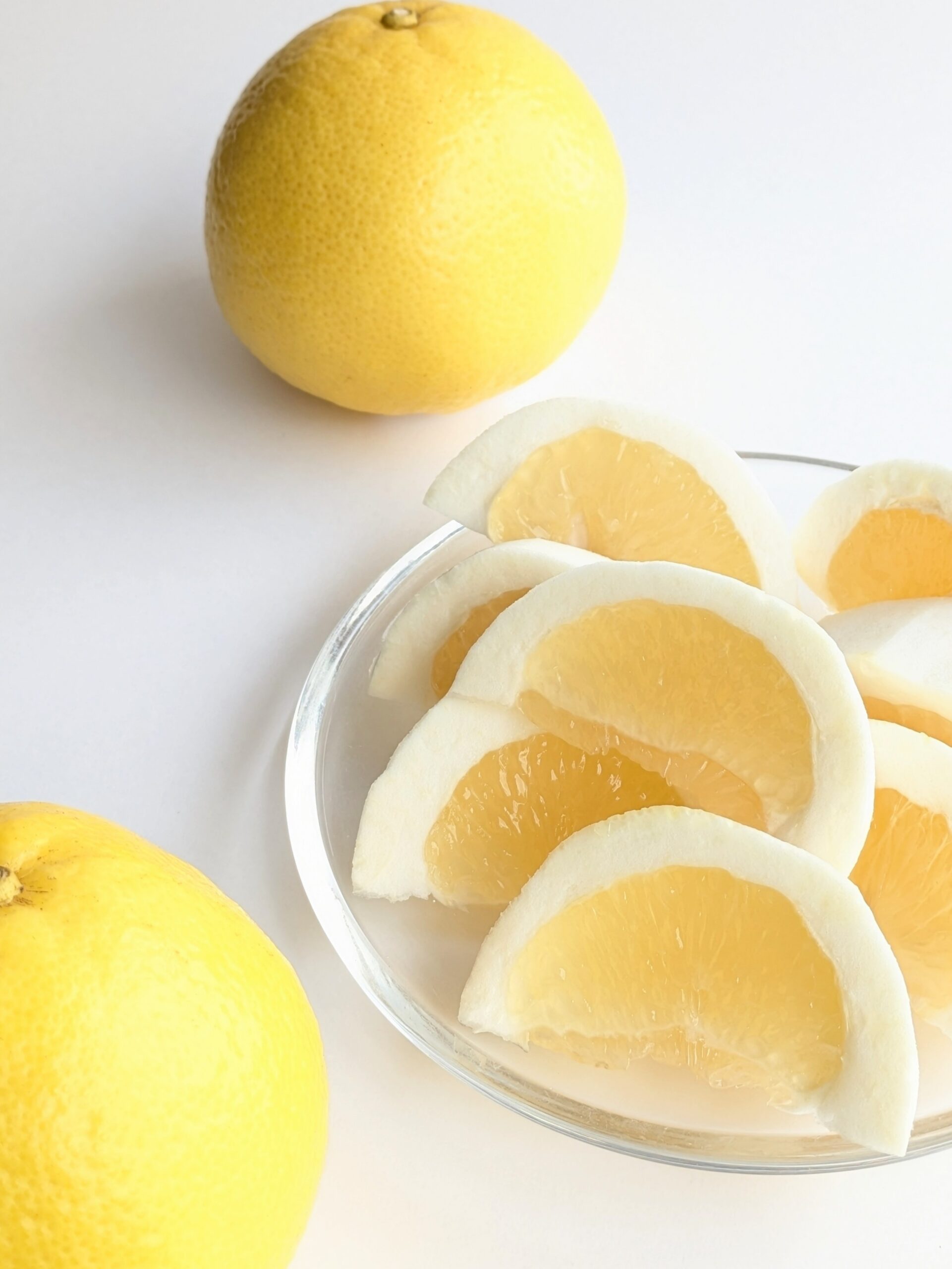 ふんわりとした白い部分(アルベド)と、みずみずしい果肉のコントラストが楽しめます。